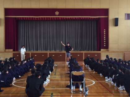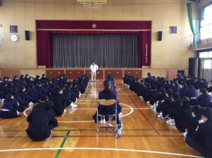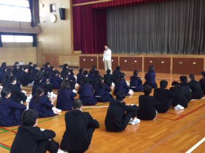 3年学年集会の様子です。今年度本校に来られた高谷先生から自分の身長にまつわる面白い話などがあり、その後、竹島先生から学校生活に関する話や修学旅行についての話がありました。