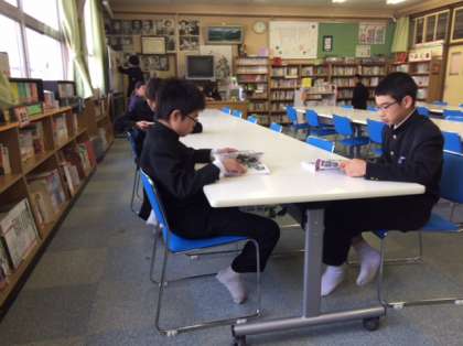 暖かくなってきました。昼休みの時間、まだボールの貸し出しがありませんが、たくさんの生徒が遊んでいます。図書室では新たに本の紹介がされる中、本を読む生徒の姿が見られます。
