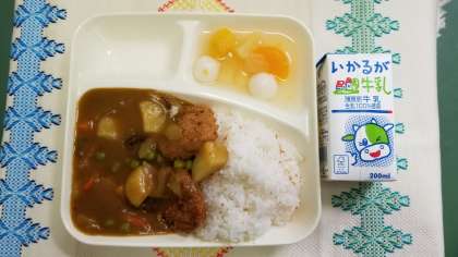 本日は、新入生の入学を祝う特別献立で、カツカレーライス、フルーツ白玉です。おいしかったですね。
