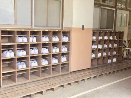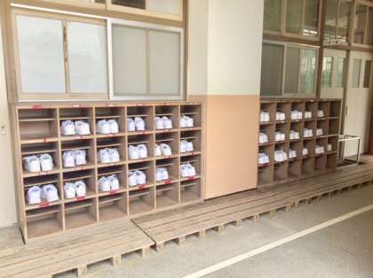 1年生の教室前を通るとどのクラスの靴箱も真っ白な靴が並んでいます。まぶしいくらいですね〜。