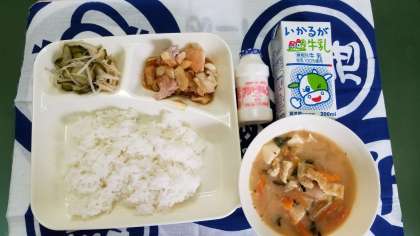 本日の献立は、焼きとり、みそ汁、きゅうりともやしのゆずの香あえ、発酵乳です。