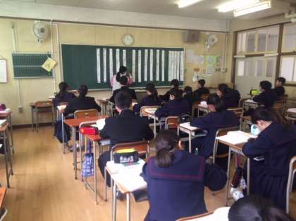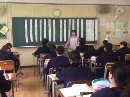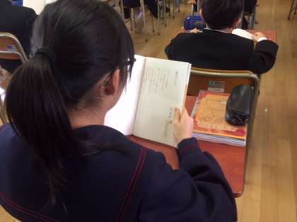 1年国語の授業の様子です。最初に文法ノート・国語便覧・ワークブックが新たに配られました。しっかりと名前を書きましょう。その後、前回に引き続き「朝のリレー」の詩を読んで、対句や比喩などの学習をしました。