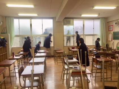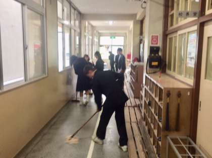 職員室前や特別教室まで全員で頑張りました。校舎は古いけど、きれいにして気持ちよく使いましょう。