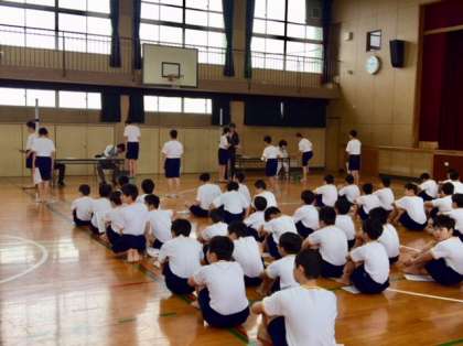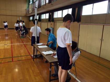 今日は、各学年とも発育測定・視力検査・学級活動をローテーションで行いました。写真は1年生の発育測定の様子です。まずは養護教諭の井出先生から健康面や各検診の意義などの話がありました。