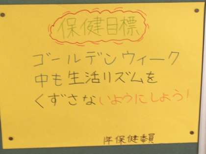 保健室前の掲示板に保健目標が掲示されています。「ゴールデンウィーク中も生活リズムをくずさないようにしよう!」です。守りましょう。