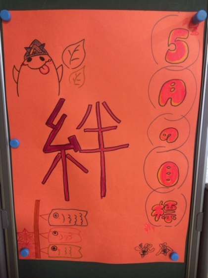 5月の学校目標が玄関ピロティに掲示されています。「絆」です。4月の生徒評議会で話し合われ、宿泊行事などに向けて絆を深めようということで決定しました。