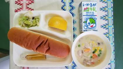 本日の献立は、コーンクリームシチュー、キャベツのひじきドレッシング、河内ばんかんです。
