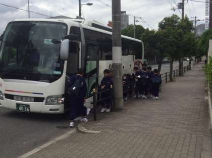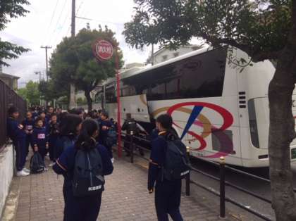 荷物を入れてバスに乗り込んでいきます。バスは3台です。2組が分乗になります。保護者の皆さん、お見送りありがとうございました。出発〜。