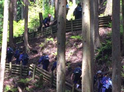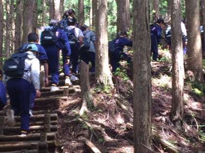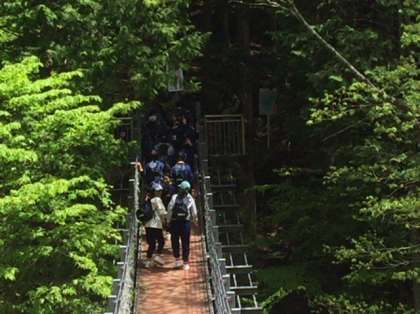 吊り橋を渡って出発です。昨日の雨で道はすべるので気をつけていきましょう。