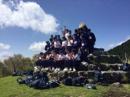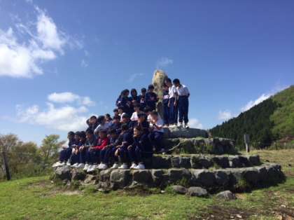 絶景をバックに学級写真撮影です。1・2組です。