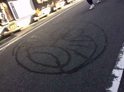朝食場所に移動する生徒の足元を見ると旅館前の道路に旅館の方が水を打ってくれてました。よく見るとなんとミッキーとドラえもんの顔です。ディズニーランドみたいですね。