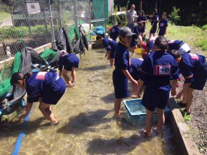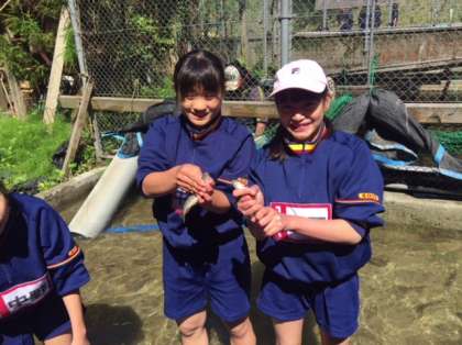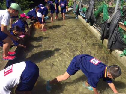 川魚センターでの魚手づかみです。素早いのでなかなか捕まりません。しかし、見事にゲットした生徒も多いです。