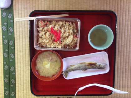 最後の食事、昼食です。かやくご飯と今日捕まえた魚の塩焼きと豚汁です。いただきます。