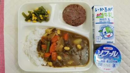 本日の献立は、牛肉と大豆のカレーライス、焼きハンバーグ、三度豆とコーンのサラダ、ヨーグルトです。