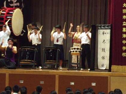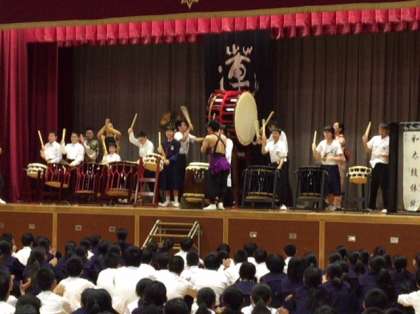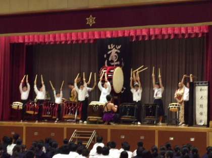 最後は和太鼓体験です。各学年から希望生徒と指名された黒田先生が体験します。なかなか楽しそうですね〜。幸輝リーダー、なかなかのコメントでした。