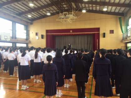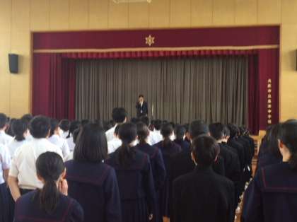 5月14日、全校集会を行いました。生徒会からは先週行った緑の羽根募金のお礼と報告がありました。校長先生からは中間テスト一週間前にあたり、テストの意味や勉強の力をつけるということの大切さなどの話がありました。