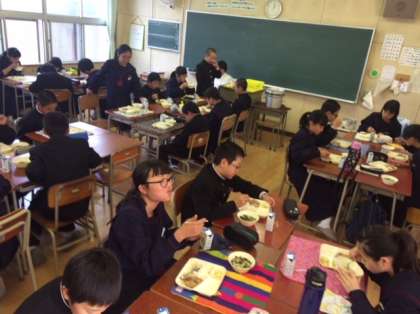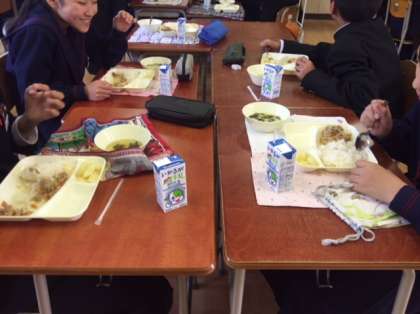 1年の給食の様子です。豚丼ですね〜。一泊移住に行ってましたので久しぶりの給食です。美味しいですかと尋ねたら、「美味しいです」と返答がありました。よく噛んで食べましょう。