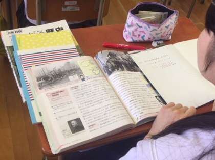 3年社会の授業の様子です。中国の排日運動と満州事変について学習しています。時代背景を考えながら南京・北京・日本の関連がよくわかるように説明が進んでいきます。