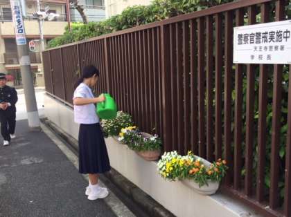 暑くなってきました。生徒会役員の生徒が玄関のプランターの花に毎朝水をやってくれています。