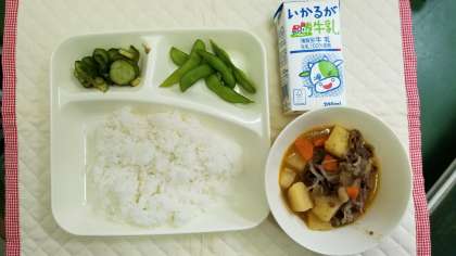 本日の献立は、肉じゃが、キュウリのかつお?風味、枝豆です。