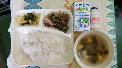 本日の献立は、プルコギ、とうふのスープ、チンゲンサイとコーンの甘酢あえ、発酵乳です。 プルコギは、しっかりとした味で、ごはんがすすんで、おいしかったですね。