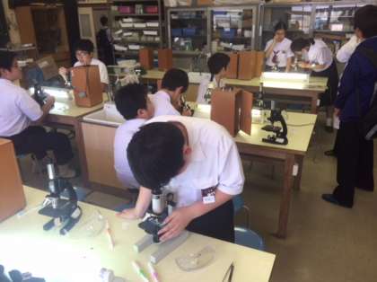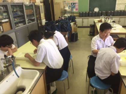 理科室では科学部が葉の葉脈を取り出しています。