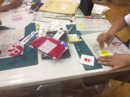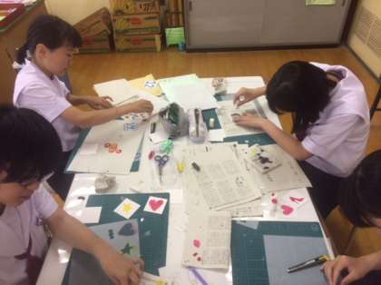 1年家庭科の授業の様子です。ステンシルコースターを作成しています。うまく切り抜いて染められるかな。よく考えたきれいな作品ができていきます。