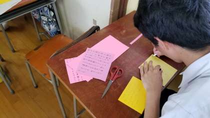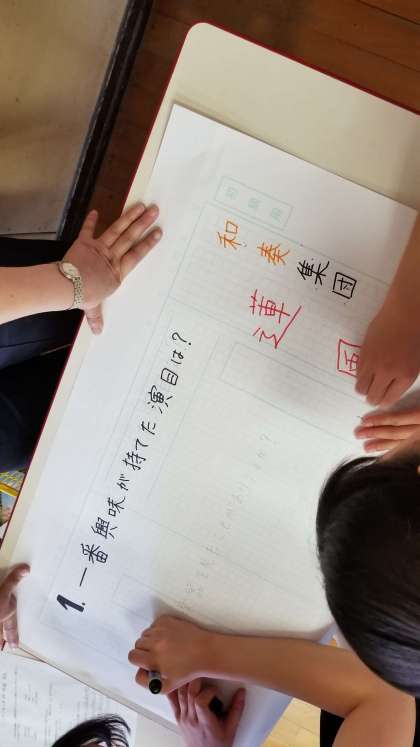 文化委員は、土曜授業で行われた芸術鑑賞の壁新聞作りです。あの太鼓の音を思い出しながら記事を書いていました。