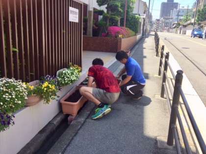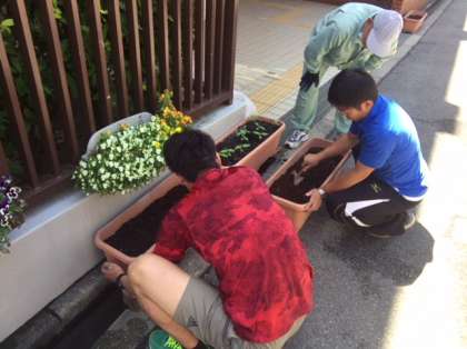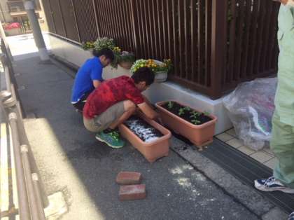 植え替えの準備をしています。プランターを4つに増やします。ひまわりは根が非常に弱いので慎重にやらなければなりません。実際の植え替えは生徒会がやるようです。