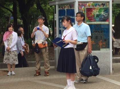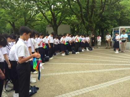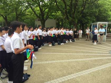 「原爆の子の像」の前で平和宣言セレモニーを行いました。生徒の司会で進行します。まず黙祷を捧げました。
