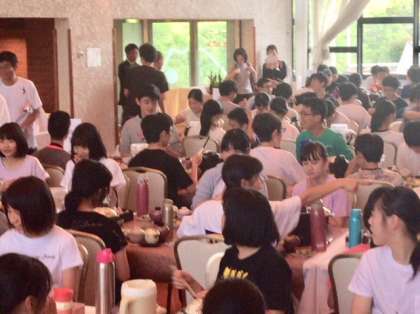 夕食です。しっかり食べましょう。食事係による「いただきます」で始まりました。