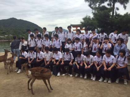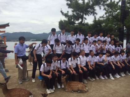 大鳥居をバックに学級写真撮影です。1・2組の様子です。