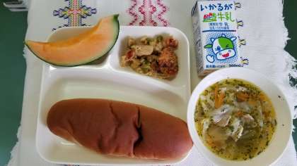 本日の献立は、カレードリア、スープ、クインシーメロンです。