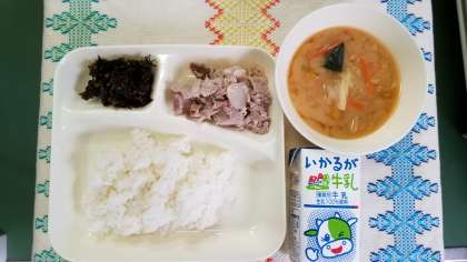 本日の献立は、豚肉のゆずの香焼き、みそ汁、のりのつくだ煮です。のりのつくだ煮はかつおぶしと、干し椎茸、きざみのりでつくる手作りでした。旨味がたっぷりでおいしかったですね。