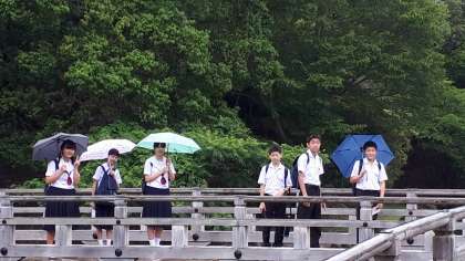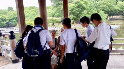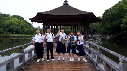 浮見堂は奈良公園内にある鷺池に浮かぶ六角形のお堂です。お堂が水面に映る姿はとても美しいです。池に浮かぶ橋を渡るとお堂の中に入れます。外国の方にインタビューしています。