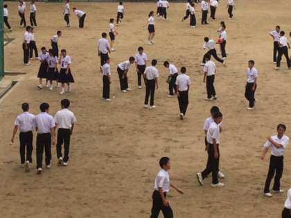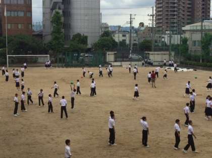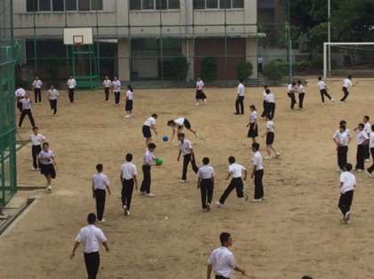梅雨ですが、今日は雨が降りそうで、なんとかもっています。昼休み、蒸し暑い中、たくさんの生徒がグランドで遊んでいます。元気ですね〜。