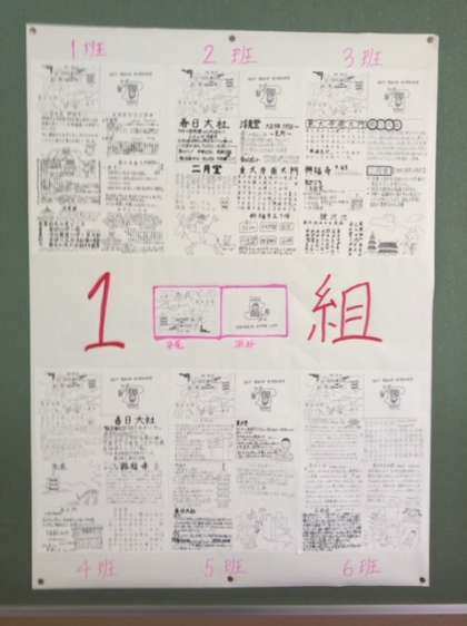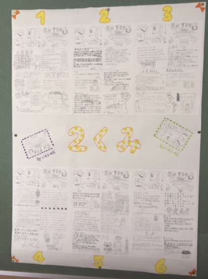 校外学習の時に作成したパンフレットが廊下に掲示されています。1・2組のパンフレットです。