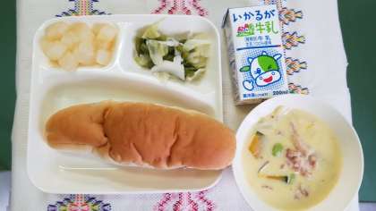 本日の献立は、かぼちゃのクリームシチュー、キャベツと三度豆のサラダ、和なしです。