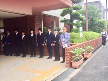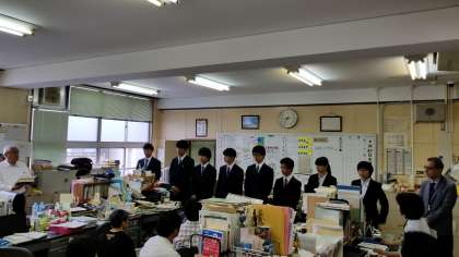 本日、教職入門実習として、将来教師を目指している大学1年生の8人が来校しています。まずは朝の挨拶の体験です。1日ですが頑張ってください。