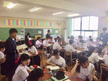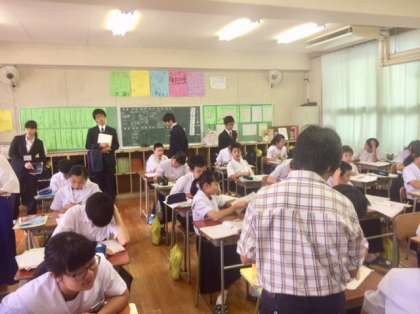 1時間目、早速4人ずつに分かれて、3年と2年の英語の授業を参観しています。