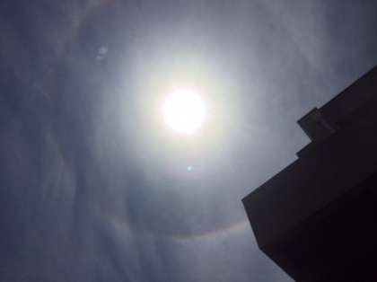 5時間目の予鈴が鳴ると同時に一人残らず教室に入っていきました。時間が守られています。生徒が「太陽、太陽、虹」と空を見上げていたので見てみると、太陽を中心に円形の虹みたいなものが出ていました。