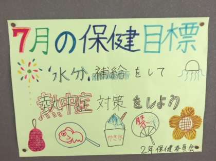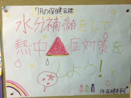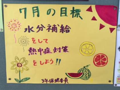 各学年の廊下掲示板に7月の保健目標が掲示されています。「水分補給をして熱中症対策をしよう」です。蒸し暑い日が続きます。しっかりと健康管理をしましょう。