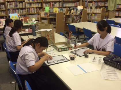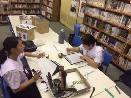 図書室では書道部が活動していました。心落ち着かせ取り組んでいます。