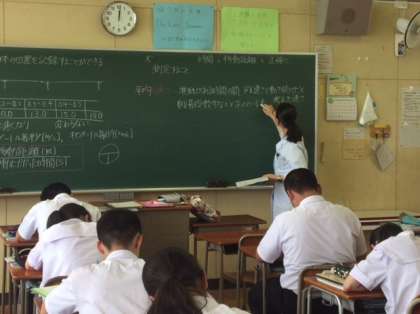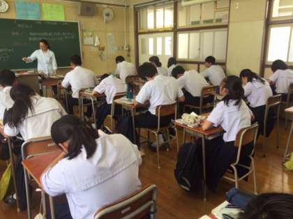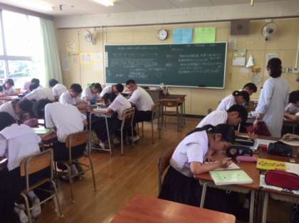 3年理科の授業の様子です。物体の運動の表し方を学習しています。授業の最後の時間を使ってプリントの問題をグループワークで解いていきます。