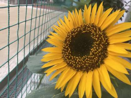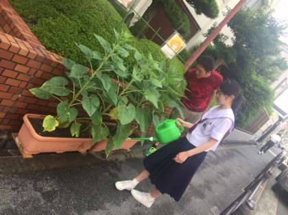 「はるかのひまわり」は70日目を迎えました。玄関のものはまだですが、グラウンド横の直植えのひまわりは、ついに一つ咲きました。太陽に向かって元気に咲いています。いい顔してますね〜。