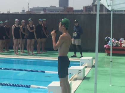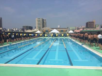 水泳大会が始まりました。今日は2年生の大会です。準備運動として、ひと泳ぎです。そして、開会式が始まりました。
