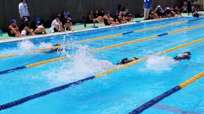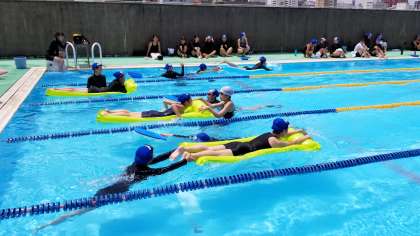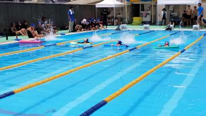 第9種目は、バラエティリレーです。第1泳者は、マットを半分にして大きなビート板にして25m、第2泳者は空のペットボトルを抱えて背泳ぎのように、第3泳者は、ビート板で25m、第4泳者はビーチマットの上に乗ってゴールまで泳ぐ、ゆったりとしたリレーです。