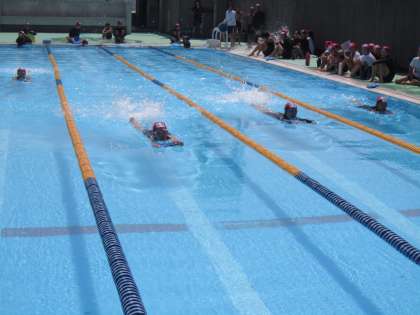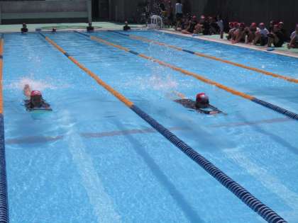 第6種目は25mバタ足です。ビート板をもってバタ足のキックだけの勝負です。