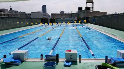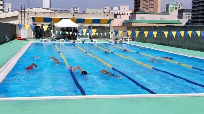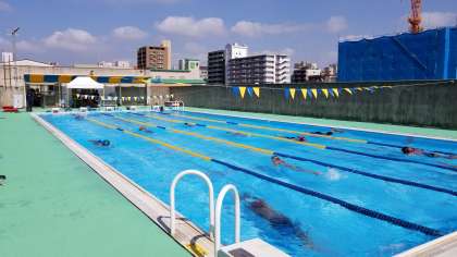 水泳部は、スタート台の横に水筒を置いて水分補給し、熱中症の予防をしてました。みんな真っ黒です。ゴーグルしている目のまわり以外ですが。