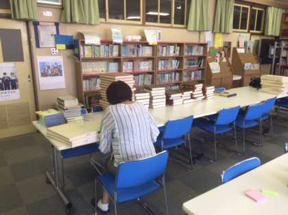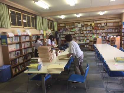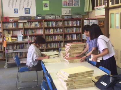 図書室ではバーコード化に向けて蔵書の整理を行っています。書道部の生徒たちも手伝ってくれています。